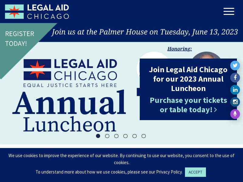 Mission Statement: Legal Aid Chicago seeks justice for people living in poverty. Through litigation and advocacy, our 150-person team of full-time lawyers and staff fight to secure individual rights to affordable housing, basic healthcare, fair working conditions, protection from abuse and economic stability.